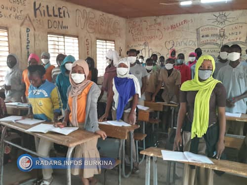 C’est le moment de la reprise du cours après la pause dans une classe de 3e. Un dispositif de lavage des mains est installé à l’intérieur, les élèves portent chacun un masque mais la distanciation physique n’est pas respectée. Noël Tougma est un des élèves de cette classe : « Les cours se déroulent bien. Les professeurs appuient sur l’accélérateur pour pouvoir rattraper le retard. Les mesures barrières sont respectées dans l’ensemble. Mais s’agissant de la distanciation, ce n’est pas le cas. Les tables-bancs ne sont pas en nombre suffisant pour que soit respecté l’écart d’1 mètre.» M. Béogo est le professeur d’histoire-géo de cette classe de 3e. Il nous confie : « Nous faisons preuve de rigueur pour que les élèves respectent les mesures barrières car ils ont tendance à les négliger ces mesures. Certains disent que quand ils portent le masque, ils étouffent. On sait qu’il sera difficile de terminer le programme, vu le temps qui nous reste. Mais on souhaite faire le maximum. Nous ne savons pas les questions qui vont être posées à l’examen, donc on essaie de voir toutes les leçons du programme ».